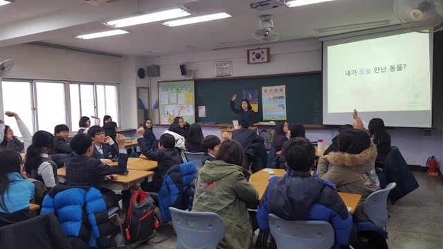 ▲강동구 소재 중학교에서 동물학교가 진행되고 있다. |