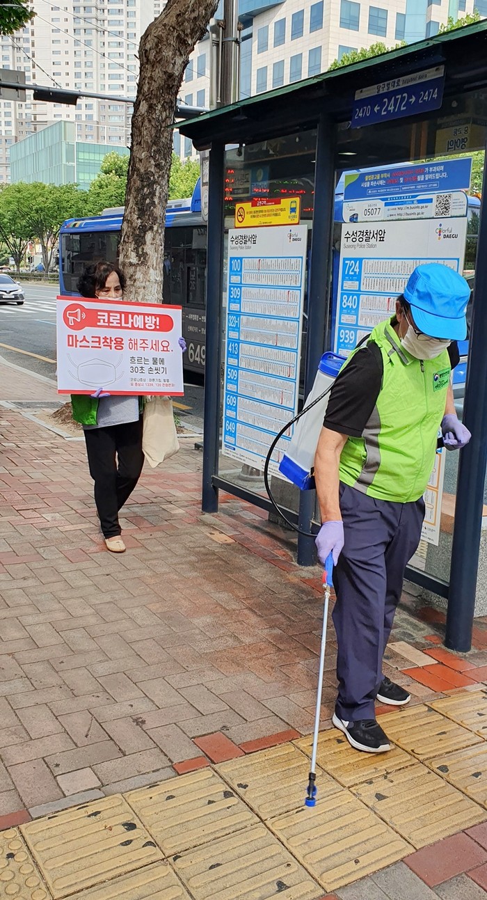 [로컬세계 박세환 기자]대구 수성구는 지난 24일 제7기 수성구 생활공감정책참여단이 코로나19 감염 예방을 위해 버스정류장 방역과 캠페인을 실시했다고 25일 밝혔다.