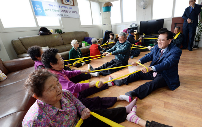 ▲찾아가는 건강경로당 체조 함께 하는 유덕열 동대문구청장. |