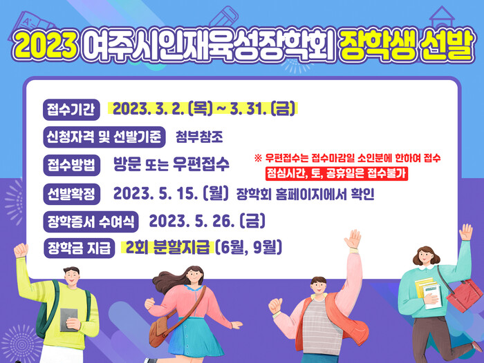 [로컬세계=김병민 기자] 재단법인 여주시인재육성장학회는 유능한 인재를 양성하고 지역사회 발전에 이바지하고자 ‘2023년 여주시인재육성장학회 장학생 선발계획’ 공고를 여주시인재육성장학회 홈페이지 및 여주시청 홈페이지에 게시했다고 11일 밝혔다.