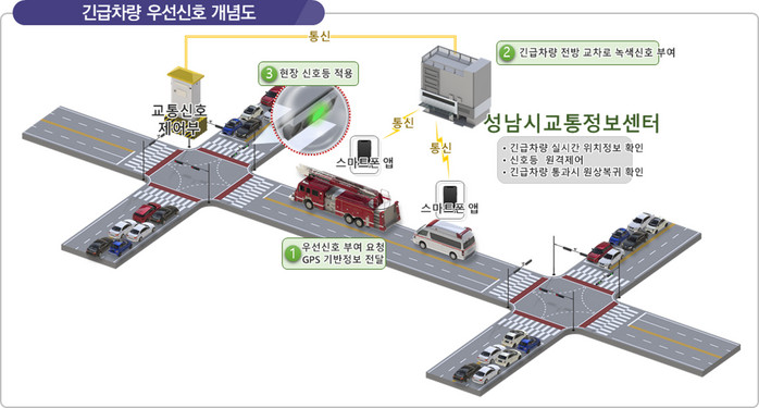 긴급차량 우선신호 시스템은 구급차와 소방차의 목적지를 성남시청 8층에 설치된 교통정보센터가 사전 공유해 이동 경로에 따라 맞춤형 신호를 부여한다. 성남시내 706곳 교차로 전체에 적용된다. 화재, 교통사고 등 긴급 상황 발생 때 현장 도착시간을 줄여 골든 타임을 확보할 수 있다.