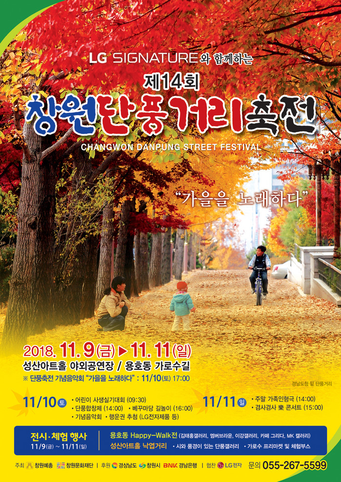 [로컬세계 한용대 기자]‘가을을 노래하다’란 주제로 'LG SIGNATURE와 함께 하는 제14회 창원단풍거리 축전'이 이달 9~11일까지 이틀간 성산아트홀 주변과 창원 용호동 일대에서 열린다.