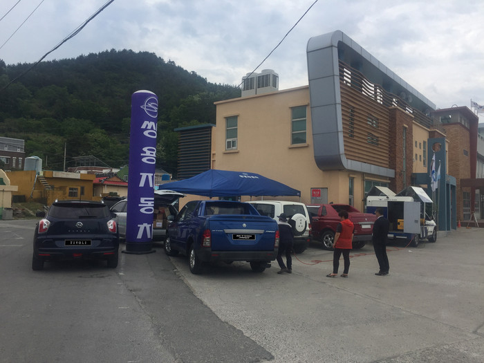 ▲쌍용차가 평소 정비서비스를 받기 어려운 도서지역 고객을 위해‘2019 도서지역 무상점검 서비스’를 실시한다고 17일 밝혔다. 사진은 지난 5월 청산도에서 시행한 무상점검 서비스에 차량을 점검 받기 위해 고객들이 기다리고 있는 모습.(쌍용차 제공) |