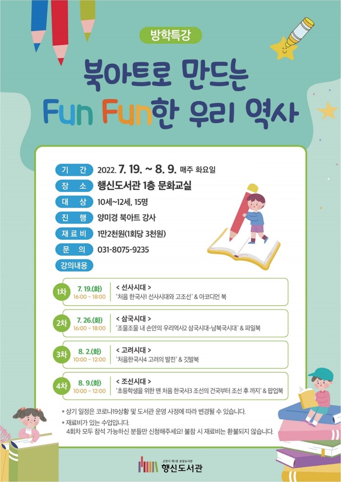 [로컬세계 = 이영원 기자]경기 고양시(시장 이동환) 행신도서관이 오는 19일부터 8월 9일까지 초등학생 대상 여름방학특강 '북아트로 만드는 FunFun한 역사이야기' 운영한다.