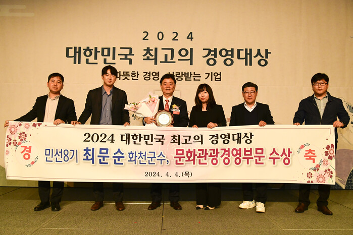 [로컬세계=전경해 기자] 최문순 화천군수가 ‘2024 대한민국 최고의 경영대상’을 수상했다. 최문순 군수는 4일 서울시 중구 더 플라자 호텔에서 매경미디어그룹 주최, 기획재정부, 교육부, 과학기술정보통신부, 보건복지부, 환경부, 고용노동부, 동반성장위원회, 기획재정위원회, 매일경제, 매경닷컴, MBN 등이 후원한 시상식에서 문화관광 경영 부문 수상자로 선정됐다.