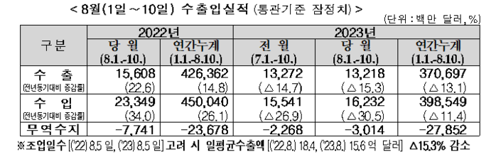 관세청은 11일, 8월 1일~10일 기간의 수출입 현황을 발표했다.