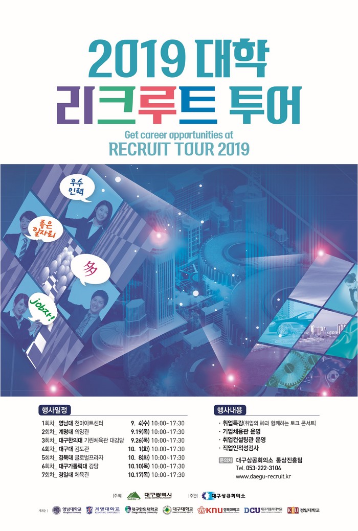 대구시는 청년 구직자들에게는 안정적인 일자리를 지역기업에게는 기업홍보와 우수인재를 확보 할 수 있는 기회를 제공하기 위해 9월 4일 영남대학교를 시작으로 '2019 대학리크루트 투어'를 진행한다.