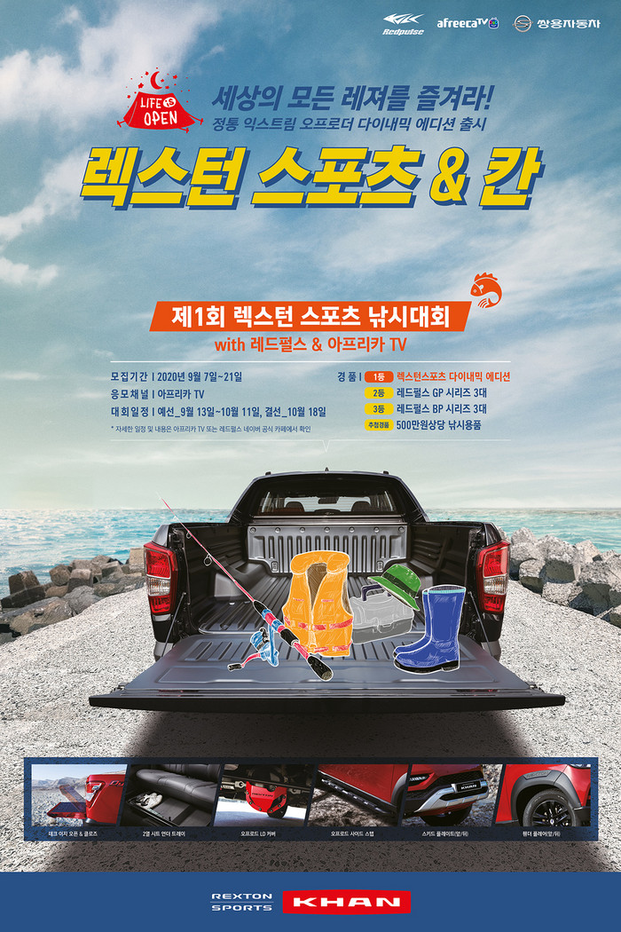 ‘제1회 렉스턴 스포츠 낚시대회’는 쌍용차가 주최, 레드펄스가 후원하며 국내 최대 1인 미디어 플랫폼 아프리카TV를 통해 방송된다. 오는 13일부터 총 5회 온라인 방식의 예선전을 진행하고, 100명의 진출자가 10월 18일 결선에서 우승을 겨룬다.