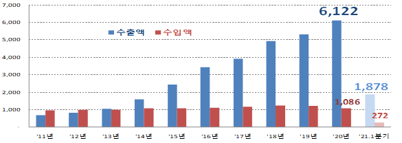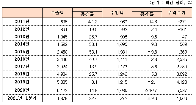 2020년 수입액은 10억8600만 달러로 전년대비 10.7% 감소했고, 올해 1분기 역시 전년 동기 대비 9.6% 줄어 최근 무역수지는 꾸준한 증가세를 나타내고 있다.