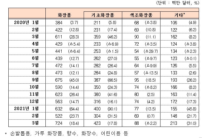 이는 마스크 생활화에 따른 피부 문제 관리를 위해 기초화장품의 수요가 증가한 때문으로 풀이된다.