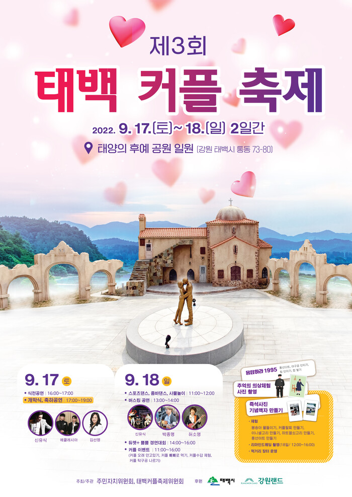 [로컬세계=박상진 기자]강원 태백시(시장 이상호)는 태백 커플 축제가 오는 17일부터 18일까지 양일간 통리 태양의 후예 공원 일원에서 개최된다고 15일 밝혔다.