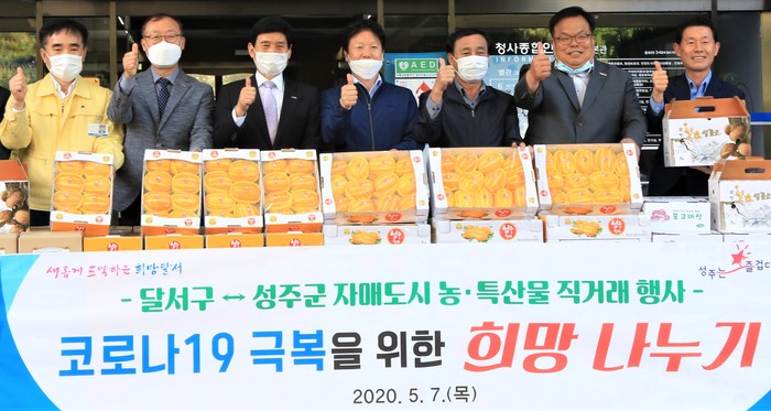 [로컬세계 박세환 기자]대구 달서구는 지난 7일 코로나19의 여파로 농산물 판매에 어려움을 겪는 농가와 희망을 나누기 위해 성주군과 농·특산물 구매 행사를 가졌다고 8일 밝혔다.