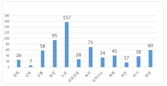 12개의 분야와 이에 포함되지 않는 기타 분야로 구성되며, 도로 분야가 23.0%(157건)으로 가장 많이 나타났다. 이후 농업 13.9%(95건), 복지 10.4%(71건), 환경 8.8%(60건), 교통 8.5%(58건), 체육 6.0%(41건), 허가 5.6%(38건), 상하수도 5.0%(34건), 문화관광 4.1%(28건), 경제 3.8%(26건), 하천 2.5%(17건), 교육 1.0%(7건) 그리고 기타 7.5%(51건)로 구성되었으며, 상위 5개 분야의 민원이 63.9%(437건)으로 과반 이상을 차지했다.