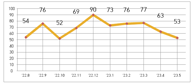 먼저 민원 추이로는 2022년 8월 54건, 9월 76건, 10월 52건, 11월 69건, 12월 90건, 2023년 1월 73건, 2월 76건, 3월 77건, 4월 63건, 5월 53건이며 월 평균 68.3건이 접수되었다