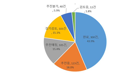민원의 처리 현황은 추진완료 43.9%(300건), 추진중 18.0%(123건), 추진예정 15.4%(105건), 장기검토 15.1%(103건), 추진불가 5.9%(40건), 검토중 1.8%(12건)이며 추진완료와 추진중을 합친 민원해소율은 61.9%(423거건)로 나타났다.(6월 기준)