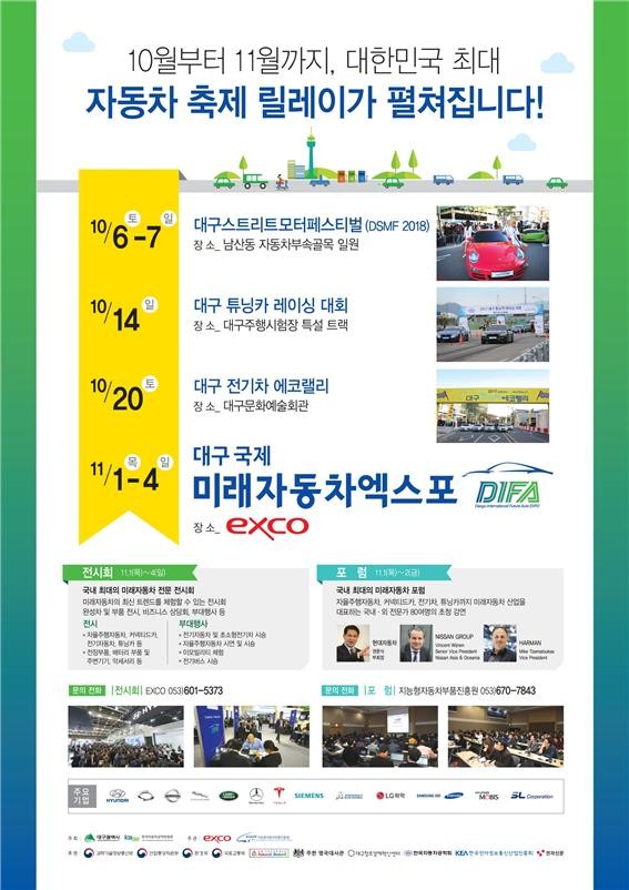 11월 1~4일에는 대망의 대구 국제 미래자동차엑스포 2018이 대구 엑스코에서 열린다. 이 행사는 미래 자동차시대를 선도하는 대구시가 지역산업의 성장을 유도하고 미래자동차에 대한 시민들의 이해와 공감대 형성을 위해 추진한다.