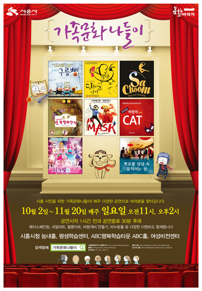 가족문화나들이는 대중성과 예술성을 바탕으로 한 인형극, 음악극, 뮤지컬 등으로 구성됐으며 매주 일요일 오전 11시, 오후 2시 시흥시청 늠내홀, ABC행복학습타운 ABC홀, 평생학습센터 등에서 무료로 공연된다.