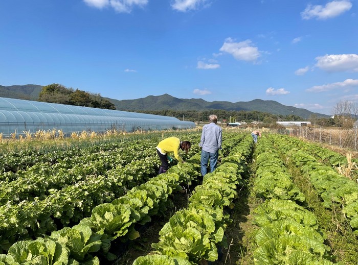 | ▲시 관계자가 관내 배추농가를 현장지도 하고 있는 모습. 용인시 제공 |