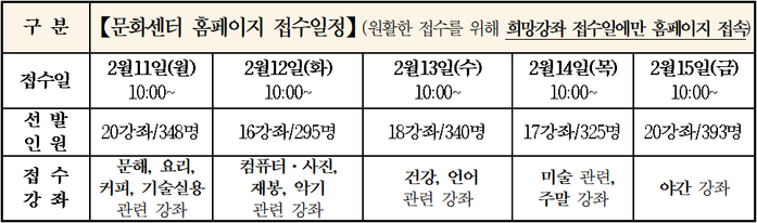 또한 접수마감일인 15일까지 신청을 놓친 시민들은 이달 18일부터 3월 15일까지 미달강좌에 한해 추가접수하면 된다.