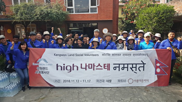 ▲강원랜드 사회봉사단이 봉사활동을 위해 네팔을 방문하면서 기념사진을 찍고 있다.(강원랜드 제공) |