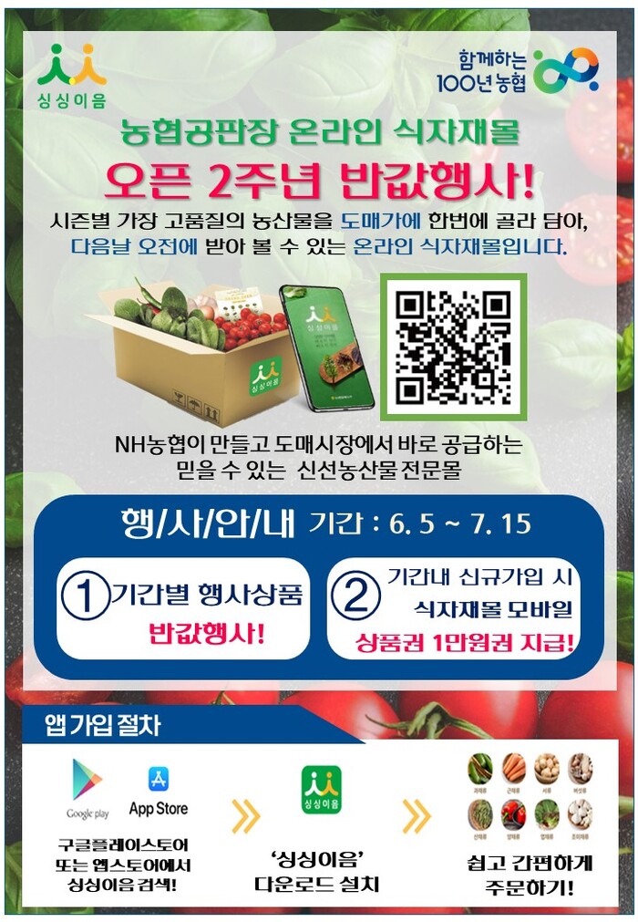 농협경제지주는 농협 온라인 식자재몰 오픈 2주년을 기념해 내달 15일까지 농산물 반값 할인 행사를 진행한다.