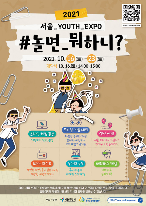 [로컬세계 임종환 기자]서울시 청소년 기관 연합 축제인 ‘2021 서울 YOUTH EXPO’가 오는 16일 온라인으로 개최된다. 23일까지 일주일간 진행될 이번 EXPO는 서울 시내 87개 청소년 기관이 참여하고, 50개 기관이 122개 프로그램을 준비했다.