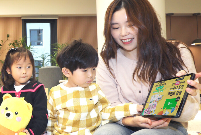 ▲LG유플러스는 키즈 전용 OTT ‘아이들나라’를 구독하면 50만원 상당의 다이슨 헤어 드라이기, 보드게임, 네이버 포인트 등을 증정하는 구독 이벤트를 다음달까지 진행한다. 사진은 아이들나라 구독 이벤트를 소개하는 LG유플러스 모델의 모습. |