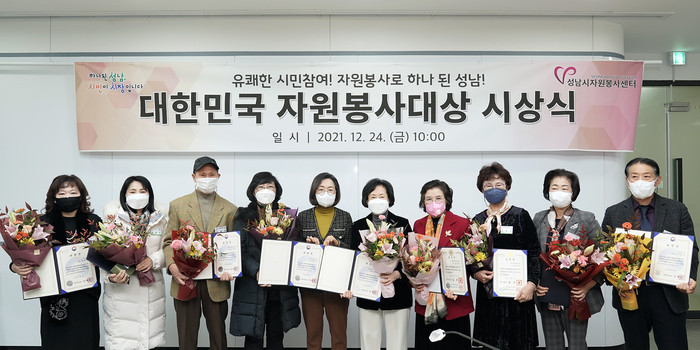 시상식은 코로나19로 열리지 않아 성남시는 이날 오전 10시 시청 2층 회의실에서 ‘대한민국 자원봉사대상 수상자 표창장 전달식’을 개최했다.