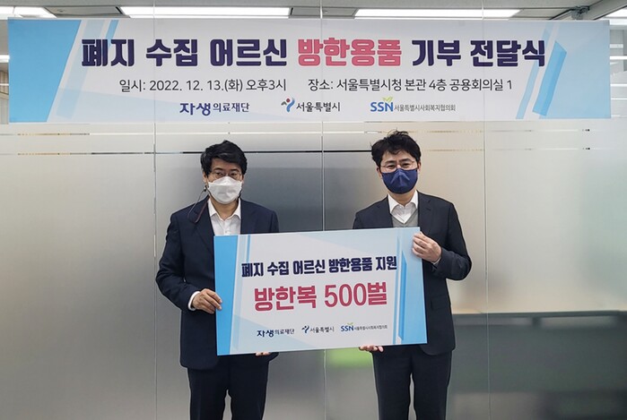 자생의료재단이 서울시와 함께 따뜻한 겨울나기 기부에 동참한다. 자생의료재단(이사장 박병모)은 지난 13일 서울시(시장 오세훈)에 폐지 수집 어르신들의 겨울나기를 위한 방한복 500벌을 기탁했다고 14일 밝혔다.