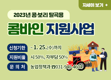 ‘콩·보리 탈곡용 콤바인 지원사업’은 관내 농가의 농업 생산성 향상과 농가 소득 증대를 위해 마련됐으며, 콤바인 구입비의 50%인 최대 4,000만원(시비100%)을 지원하는 사업이다.