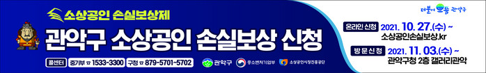구는 온라인 신청이 어려운 관내 소상공인의 현장접수를 위해 전담창구를 운영한다. 다음달 3일부터 구청 2층 갤러리관악에 전담창구를 마련하고 접수 및 안내 인력을 투입해 코로나19로 어려움을 겪는 소상공인 손실보상 지원에 총력을 기울일 계획이다.