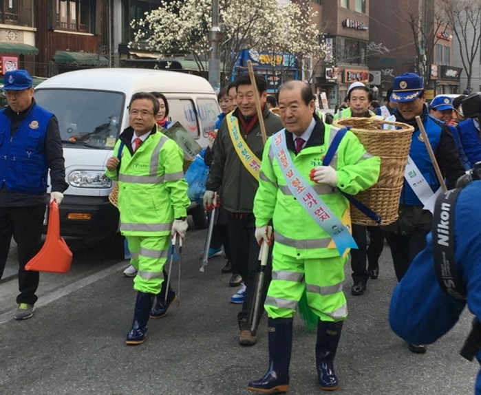 ▲박홍섭 마포구청장을 비롯해 공무원, 시민들이 거리청소를 하고 있다. |