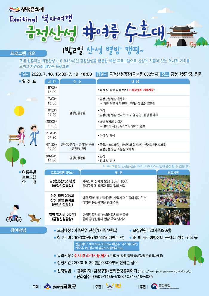 현존하는 국내 최장(18,845m)인 금정산성의 역사적 가치를 느끼고 배울 수 있는 '금정산성 여름 수호대' 프로그램은 금정산성잔디광장에서 1박2일 캠핑을 즐기며 △별밤 가족운동회 △별밤 콘서트 △별밤 별자리이야기 △금정산성 동문 역사트레킹 등 여름밤의 향취를 만끽할 수 있는 다양한 공연과 흥미로운 체험 이벤트들로 진행되어 참가자들에게 잊을 수 없는 멋진 추억을 선사할 것으로 기대된다.