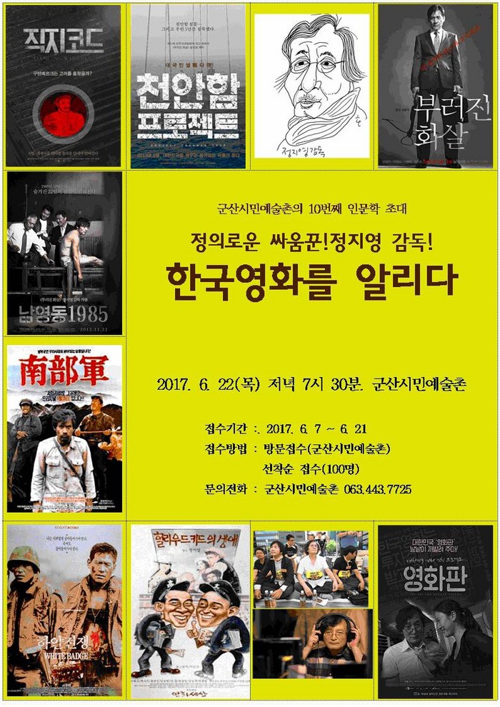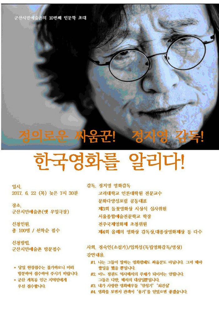 [로컬세계 양해수 기자]군산시민예술촌(촌장 박양기)은 정지영 영화감독을 초청하여 오는 22일 오후 시민예술촌 공연장에서 인문아카데미를 연다.