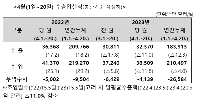 [로컬세계=최종욱 기자]관세청은 4월 1~20일 기간 수출이 324억 달러로 작년 같은 기간보다 △11.0%(40.0억 달러↓) 줄었다고 21일 밝혔다. 수입은 365억 달러로 전년 동기 대비 △11.8%(48.6억 달러↓) 감소했다.