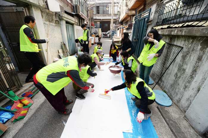 ▲청량리동의 ‘나눔이웃’ 회원들이 저소득 가구의 집수리 봉사활동에 참여해 도배작업을 하고 있다.(동대문구 제공) |