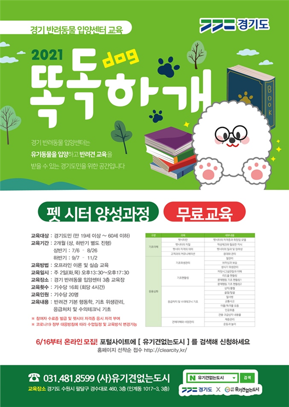 [로컬세계 이혁중 기자]경기도는 반려동물 입양센터 교육 '똑독하개' 프로그램 중 하나인 ‘반려동물 돌보미(펫시터) 양성과정’에 참여할 교육생을 모집한다고 17일 밝혔다.