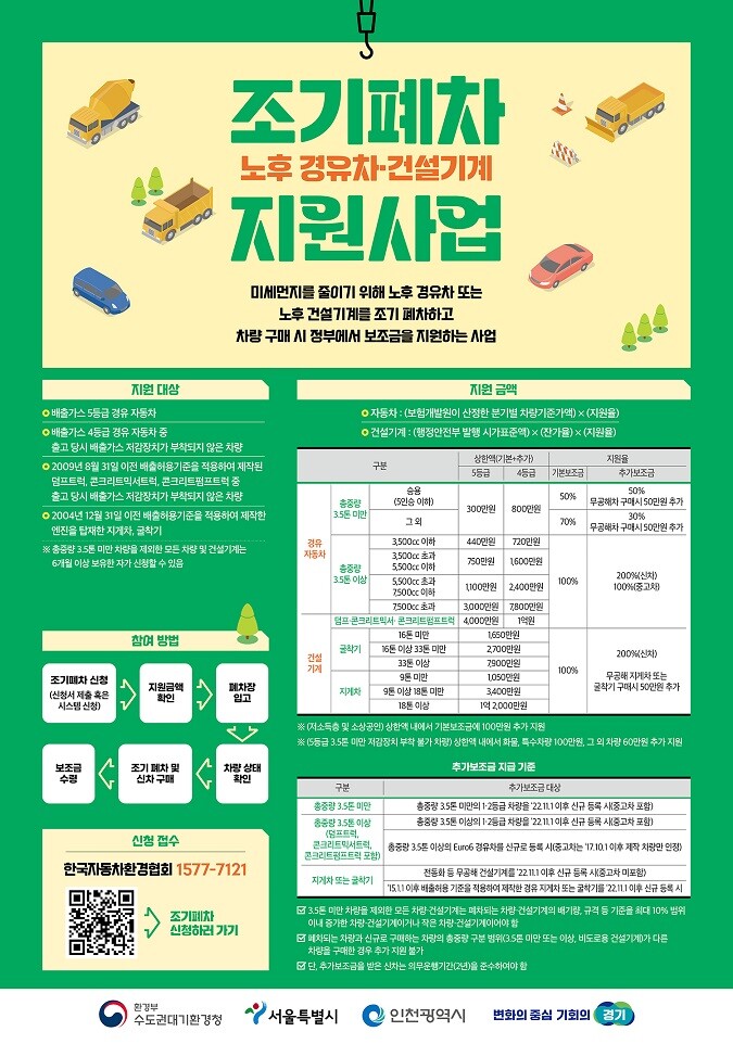 지원 대상은 배출가스 4·5등급 경유자동차와 2009년 8월 31일 이전 배출허용기준을 적용받고 제작된 도로용 3종 건설기계 및 2004년 이전 배출허용기준을 적용해 제작된 지게차, 굴착기다.