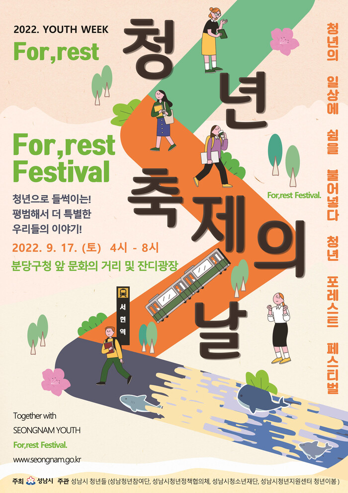 시는 청년의 날 당일 오후 4시~8시 분당구청 앞 문화의 거리에서 ‘청년, 포레스트(For,rest=청년의 휴식을 위해) 축제’를 연다.