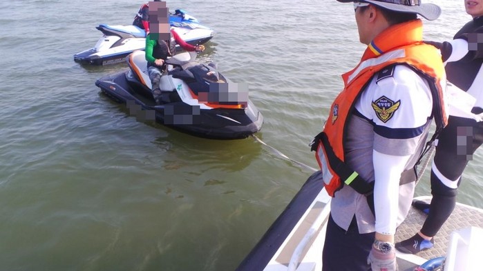 신고를 접수한 부산해경은 명지파출소 연안구조정을 사고 해역으로 급파, 레저활동자들의 안전 상태를 확인하고 연안구조정으로 수상오토바이 2대를 예인해 명지항으로 입항조치 했다.