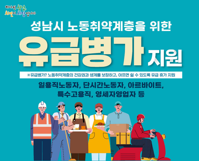 성남시는 노동 취약계층 사회안전망 구축을 위해 유급병가를 포함한 산재보험료, 상해보험 등 3종 지원사업을 추진 중이다.