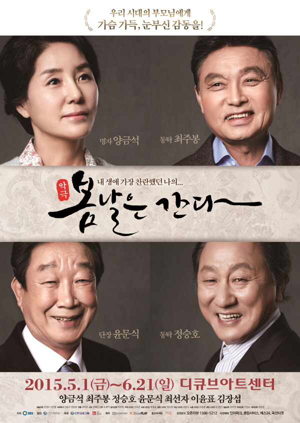 5월 1일부터 시작해 6월 21일까지 계속되는 올해 공연에는 대한민국 악극을 대표하는 최고의 배우 최주봉, 윤문식과 함께 탄탄한 연기력을 자랑하는 배우 양금석과 정승호가 새롭게 합류하고 영호와 드라마에서 카리스마 넘치는 연기를 보여주고 있는 배우 최선자, 뮤지컬 배우 이윤표 등 대한민국을 대표하는 명품 배우들이 대거 참여해 보다 깊은 여운을 지닌 우리 시대 부모님들의 이야기를 들려주고 있다.