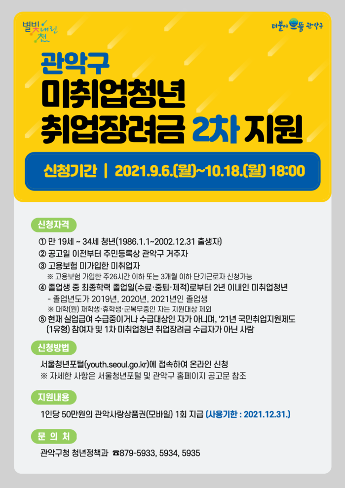 [로컬세계 임종환 기자]서울 관악구가 오는 9월 6일부터 코로나19 장기화로 어려움을 겪는 미취업 청년들을 위한 취업장려금 2차 신청을 시작한다.