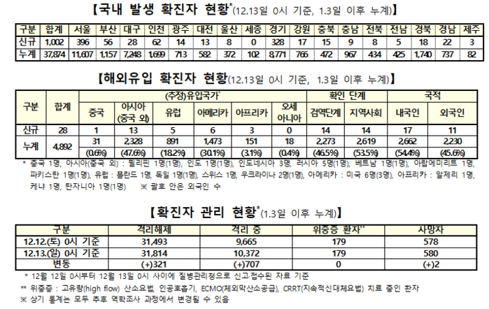 질병관리청 중앙방역대책본부(본부장:정은경 청장)는 13일 0시 현재, 국내발생 신규 확진자는 1002명이 확인됐고, 해외유입은 28명이 확인돼 총 누적 확진자수는 4만2766명(해외유입 4892명)이라고 밝혔다.