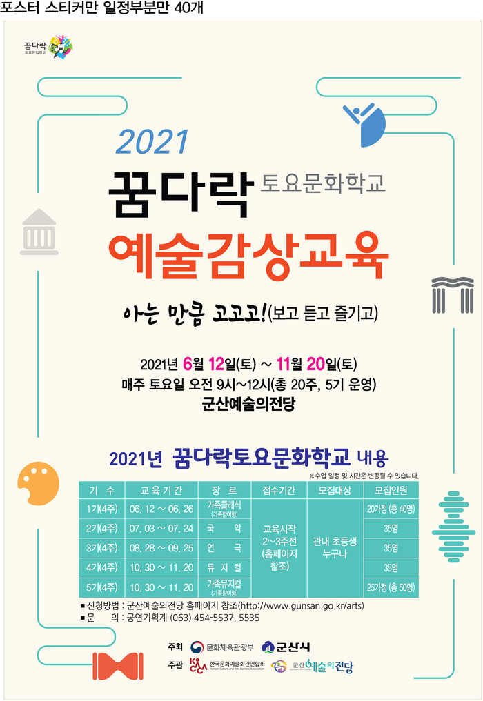 꿈다락 토요문화학교는 가족클래식(1기), 국악(2기), 연극(3기), 뮤지컬(4기), 가족뮤지컬(5기)의 수업으로 구성해 추진 중이다. 관내 초등생은 누구나 수강 가능하고 수강료는 무료다. 자세한 교육일정 및 접수방법은 군산예술의전당 홈페이지를 통해 확인 가능하다.