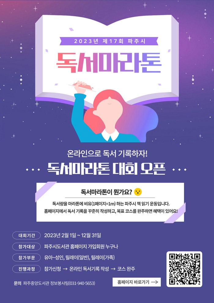 독서마라톤 신청은 파주시도서관 홈페이지를 통해 가능하며, 자세한 사항은 파주시중앙도서관으로 문의하면 된다.