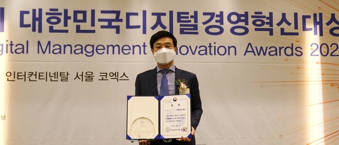 ▲레몬헬스케어의 홍병진 대표가 '22회 대한민국 디지털경영혁신대상’의 헬스케어 부문에서 과학기술정보통신부 장관상을 수상한 뒤 포즈를 취하고 있다. |