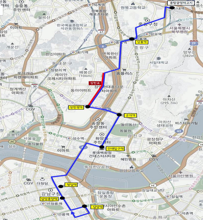 새로 신설되는 2416번 버스는 중랑공영 차고지를 기점으로 상봉역(7호선), 장한로 일대, 장한평역(5호선), 군자역(5·7호선), 건대입구역(7호선) 및 삼성역(2호선)을 운행하는 알짜노선이다. 배차간격은 13~16분이다.
