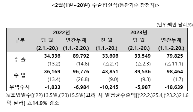 관세청은 2월 1~20일 기간 수출이 335억 달러로 작년 같은 기간보다 2.3%(7억9000만 달러↓) 줄었다고 21일 밝혔다.