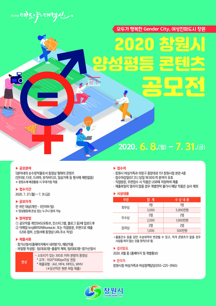 [로컬세계 한용대 기자]경남 창원시는 여성친화도시 조성 공감대 형성을 위해 이달 말까지 ‘2020 창원시 양성평등 콘텐츠 공모전’을 실시한다고 24일 밝혔다.